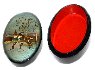 The box is constructed from paper-mache. Black lacquer covers the exterior and red lacquer covers the interior of the box. Gold and aluminum ornamentation wraps around the sides of the box. The box is not hinged. The box rests on a flat bottom. It is signed with the name of the artist. < br>