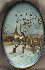 The compositional depicts a landscape that is typical for Russian countryside: the spring is just arriving, and one of the signs of this is the return of rook birds. They are sitting in the branches of a tree that has not yet begun to sprout leaves, so their nests are clearly visible. Just beyond the trees, a pool of water, perhaps formed by melting snow, reflects the sky and landscape. In the middle ground stands a small village, with an attractive Orthodox church with small gold cupolas and a tall bell tower. A little puff of smoke rises from the chimney of the house on the left. In the distance, the fields, rivers and forests of the Russian landscape stretch off far into the distance, giving the feeling of standing in an immense, expansive landscape. The drawing here is almost impressionistic, with bold strokes of paint creating the illusion of form and lighting, rather than there being a lot of very precise details. The rooks, for example, are little more than spots of dark paint, resting above lighter, thin and hurried collections of brushstrokes that suggest their nests. Spots of different colored paint create the illusion of details in the church tower, as well. This is not to say the work is not successful -- this scene tends to lend itself to the painterly, impressionistic techniques one sees here. The pond on the right has a realistically reflective look, and the application of crushed aluminum powder in the sky and snowy ground adds a striking brilliance -- one gets a sensation of the cool atmosphere and brightness of an early spring day. And the landscape in the distance has a surprisingly realistic look. The openness and expansiveness of the Russian landscape comes across very well in this work.