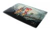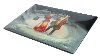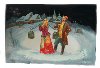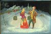 This classic composition is nicely executed by the Fedoskino artist Ludmila Rogatova. The palette of this composition is toned down and subdued to show a winter evening scene. There is a pleasant contrast between the colorful dress of the woman and the wintry landscape. The costumes of the girl and a lad are painted over metallic leaf, which really lights up the drawing.