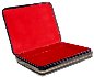 The box is constructed from paper-mache. Black lacquer is used to paint the exterior of the box while red lacquer completes the interior of the work. A hinge is fastened from the left of the scene, and the box rests on a flat bottom. The box is signed with the name of the artist and a year of 2019.