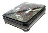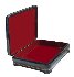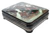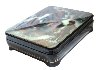 The box is constructed from paper-mache. Black lacquer is used to paint the exterior of the box while red lacquer completes the interior of the work. The lid is hinged from the left of the painting, and the box rests on four legs.