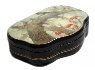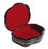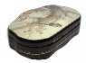 The box is constructed from paper-mache. The lid is hinged at top, and the box rests on a wavy platform. The box's interior is covered with red lacquer, the box's exterior is covered with black lacquer. Signed with the artist's name, Fedoskino, and the year of 2016.