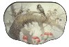 More bright and red hatted fly agaric mushrooms are painted at the lower part of the composition.