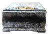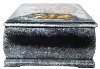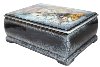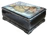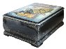 The box is constructed out of paper-mache. Black lacquer is used to paint the exterior and red lacquer is used to paint the interior of the box. The box has a hinge located above the composition and rests on the four legs, that comes from the platform of the bottom. The artist wrote the Fedoskino,2019 and signed her name under the composition.