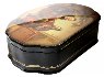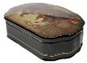 The box is constructed from paper-mache. The lid is hinged from the top of the scene, and the box rests flat. The work is signed with the artist's name and the village of Fedoskino.