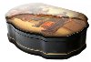 The scene is painted in darker tones of figures painted against the light green background, but the predominance is given to greens and blues. The box's exterior is traditionally covered with black lacquer. The box's interior is covered with red lacquer.