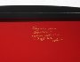 The box is made out of paper-mache. Black lacquer covers the exterior and red lacquer covers the interior of the box. A hinge has been fastened to the top of the composition, and the box rests on four round legs. The artist has written the title, Kholui, 2015, and his name at the bottom of the composition. He has written the same on the interior of the lid.