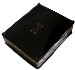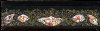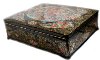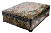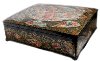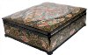 The box is constructed from paper-mache. Black lacquer is used to paint the exterior of the piece while radiant red lacquer completes the interior of the work. A hinge has been fastened to the top of the composition. The lid's composition has been framed with a thin string of golden beads that reflects nicely in the golden contours within the composition. Gold floral ornamentation, with aluminum accents, wraps around the sides of the box. The artist has written the title, Kholuy and his name at the exterior of base of the box.