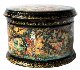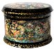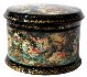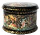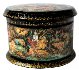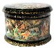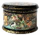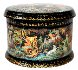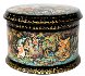 This cylinder-shaped box features several scenes from the Russian folk tale "Ivan Tsarevich and the Grey Wolf".