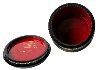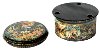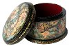 The box is constructed out of paper-mache. Black lacquer is used to paint the exterior and red lacquer is used to paint the interior of the box. The box is not hinged and rests on three feet.