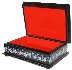 The box is constructed from paper-mache. Black lacquer is used to paint the exterior of the box while red lacquer completes the interior of the work. The box is hinged from the top of the composition, and rests on four legs. The box is signed with the artist's name, the village of Mstera and the title: "Moscow Kremlin, 18th Century " at the bottom of the composition on the lid.