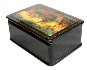 The edges of the lid are adorned with an intricate pattern painted in gold. A hinge is fastened to the top of the composition and the box rests flat.