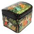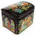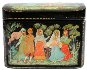 The box is made out of paper-mache made. Black lacquer covers the exterior and red lacquer covers the interior of the box. The lid is hinged from the top of the painting on a lid and the box is signed with the artist's name and Palekh.