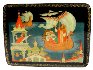 By the tsar's order, Tsar Saltan's wife and his son, Prince Gvidon, were sealed in the barrel that afterward was thrown into the sea. The barrel landed to a mysterious island. Getting out of the barrel Prince and his mother saw a magnificent palace where they would live later. On a lid we can see a moment when Tsar Saltan with his Navy is going to visit an Island.