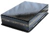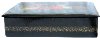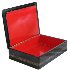 The box is constructed from paper-mache. Black lacquer is used to paint the exterior of the box while red lacquer completes the interior of the work. The lid is hinged to the top of the composition, and the box rests flat.