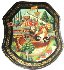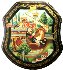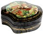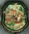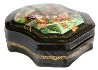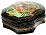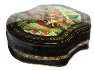 Description: This interesting box is a work of a talented and well-known Palekh artist, Ekaterina Bykova. It shows a fantasy scene including a flying ship with people wearing medieval clothes. A lady to the left is possibly tore the string with the beads. To the left, on the back of the ship we can see a Bird of the size of a Boy, who is near her... The ship is flying over the beautiful Summer Landscape.