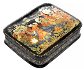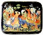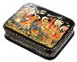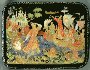The composition painted in the traditional Palekh style is very bright and colorful. Gold and aluminum paint applied with a very thin brush helps the artist to accentuate richness of the characters' costumes and splendour of the architecture.