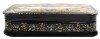 The exterior is decorated with rich gold ornaments accented on the sides with aluminum. The lid is hinged, and the box rests on the four round legs.