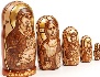 The first doll features the Blessed Virgin with the Child, the second one features Jesus Christ, the third doll shows Archangel Mikhail, the fourth one shows Saint Nicholas, and the last and the smallest one again features Jesus Christ.