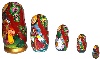 Description: This festive set of nesting dolls is an original author work of Nadezhda Romenskaya. The set includes five brightly colored, wooden dolls. Each of five dolls has the same neatly painted face and wears a beautiful Pavloposadsky shawl.