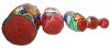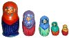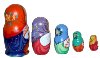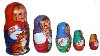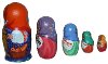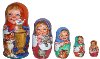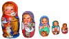 Description: This charming nestling-doll was painted by artist Lukash from the town of Sergiev Posad. It includes 5 dolls and each of them depicts children with animals. Little girls dressed in peasant costumes merrily look at the viewer. Their heads are covered with bright red, blue, pink, and green kerchiefs. They are dressed in multicolored sarafans and white embroidered shirts.