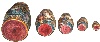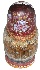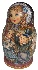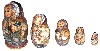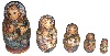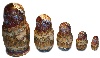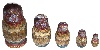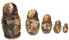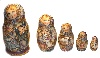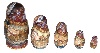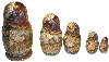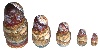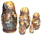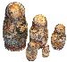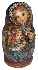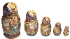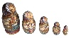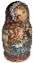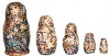 Description: This set of nesting dolls is the production of Sergiev Posad Art School. It was created by the famous artist, Irina Solovyova. The set includes five dolls. Each of them shows attractive girls wearing kerchiefs and sarafans; on some of the dolls this image is enriched by the images of happy children wearing festive clothes, toys, charming kittens, puppies and rabbits. The costumes of the characters are skillfully painted using various color combination and decorated with gold and silver powders, and also with shimmering red, green and silver spangles. The biggest doll is signed with the artist's name, the year of 2002, Russia and her personal emblem. The other dolls are signed only with the year of 2002 and the artist's personal emblem.