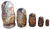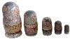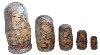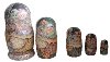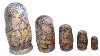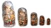 Description: This set of nesting dolls is the production of Khot'kovo Matrioshka. It was created by the famous artist, Irina Solovyova. The set includes five dolls. Each of them shows attractive girls wearing kerchiefs and sarafans; on some of the dolls this image is enriched by the images of happy children wearing festive clothes, toys, charming kittens, puppies and rabbits. The costumes of the characters are skillfully painted using various color combination and decorated with gold and silver powders, and also with shimmering red, green and silver spangles. The biggest doll is signed with the artist's name, the year of 2016.