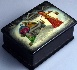 The box is made out of high-quality paper-mache. Black lacquer covers the exterior and red lacquer covers the interior of the box. An intricate gold ornaments wraps around all four sides of the box. The lid is hinged from the top of the composition, and the box sits on a flat bottom. The box is signed with the name of the artist and village, and year (1999).