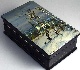 The box is constructed from paper-mache. Black lacquer covers the exterior and red lacquer covers the interior of the box. Gold ornamentation wraps around the sides of the box. A hinge is fastened to the left of the composition. The Fedoskino "troika" insignia can be found on the interior of the lid. The box rests on a flat bottom. It is signed with the name of the artist, village and year (2002). < br>