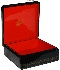 The box is constructed from paper-mache. Black lacquer is used to paint the exterior of the box while red lacquer completes the interior of the work. The edges of the lid and the sides of the box are decorated with intricate gold patterns. The lid is hinged from the top of the composition, and the box rests flat. The Fedoskino "troika" insignia can be found on the interior of the lid. The box is signed with the artist's name.