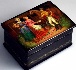Description: This traditional Fedoskino box was painted by Nina Kovalyova. The composition shows a handsome hussar who asks village girls to give him to drink. It's a rare chance to meet such a handsome and elegantly dressed man in the remote Russian village, and the girls do their best to please him. Putting her yoke and pails on the ground, one of them offers him a cup of fresh, cold well-water. The other girl holds a big samovar in her hands and proposes the gallant hussar to drink tea. In the background the artist depicts the hussar's steed and the gates of a village house.