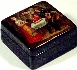 The box is constructed from paper-mache. Black lacquer is used to paint the exterior of the box while red lacquer completes the interior of the work. The box isn't hinged and rests on a flat bottom. The Fedoskino "troika" insignia can be found on the interior of the lid. The box is signed with the artist's name, village and year (1999).