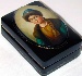 Description: This detailed portrait continues one of the most popular Fedoskino themes and shows a young beautiful girl dressed in traditional Russian costume. She wears the warm blue hat decorated with fur and the green coat adorned with the big fur collar. She also wears dangling earrings and a pearl necklace. The girl's face is elaborately drawn. Her flesh is slightly rosy and her expression is that of one satisfied. Aluminum powder is added to some parts of the costume, creating the beautiful decorative effect and a source of light from within. The background is light grey. The portrait is painted on an oval that is situated a little higher than the other space of lid. The portrait and the sides of the box are decorated with gold patterns. The box is made out of paper-mache. It has a hinge from the left of the composition and rests a flat bottom. Black lacquer covers the exterior and red lacquer covers the interior of the box. The Fedoskino "troika" insignia can be found on the interior of the lid. The box is signed with the artist's name and village.