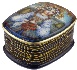 The scene is framed with a wide gold line, whereas the sides of the box are elegantly decorated with golden threads. For additional decoration the black lacquer of the box's sides and its base is mixed with blue spangles.