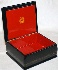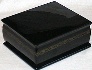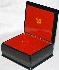 The box is constructed from paper-mache made in the village of Fedoskino. Black lacquer is used to paint the exterior of the piece while red lacquer completes the interior of the work. The box's sides are decorated with beautiful gold patterns. The lid is hinged and the box rests on a flat bottom. The work is signed with the artist's name and the village of Fedoskino.