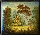 Different shades of green are used to paint this landscape. Aluminum paint is used to paint the sky and the fog, whereas gold powder is used to paint the meadow illuminated with the golden rays of the raising sun.