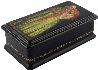 The box is made out of paper-mache from Fedoskino. Black lacquer covers the exterior and red lacquer covers the interior of the box. The edges of the lid and the box's sides are decorated with intricate gold patterns. The box has a hinge to its left and rests on a flat bottom. The Fedoskino "troika" insignia can be found on the interior of the lid. The box is signed with the artist's name (Vlasova E.), village and year (2003).