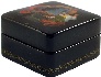 The box is constructed from paper-mache. Black lacquer is used to paint the exterior of the box while red lacquer completes the interior of the work. The sides of the box are decorated with intricate gold patterns. The box has a hinge from the top of the composition and rests on a flat bottom. The Fedoskino "troika" insignia can be found on the interior of the lid. The box is signed with the artist's name, village and year (2001).