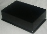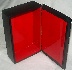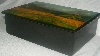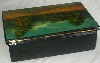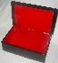 The box is constructed from paper-mache. Black lacquer is used to paint the exterior of the box while red lacquer completes the interior of the work. The lid is hinged from the top of the composition, and the box rests flat. The work is signed with the artist's name and the village of Fedoskino.