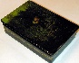 The box is made out of paper-mache. Black lacquer covers the exterior and red lacquer covers the interior of the box. The lid is hinged from the left of the composition, and the box sits on a flat bottom. The box is signed with the name of the artist, and year (2005).