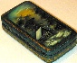 Intricate gold ornamentation decorates the edges of the lid, and the box's sides. The exterior of the box is covered with blue, light gray and silver blurry spots. This is so called "dust resist patterns" that imitate the coloring of a marble. The interior of the box is traditionally red.