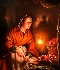 The areas of the scene not alight by candles are painted in dark brown tones, whereas the areas alight by candles are drawn in different shades of orange.