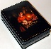 The box is made out of paper-mache. Black lacquer covers the exterior and red lacquer covers the interior of the box. It has a hinge from the left of the composition and rests on four legs. The box is signed by the artist, but hardly to read.