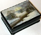 This gorgeous box by S. Parmeonov of Fedoskino depicts the clarity and beauty of a winter day. The scene depicts a frozen, icy river and the surrounding landscape filled with trees and snowdrifts. The landscape is lyrical and romantic. Snow-covered trees, with delicate lace-like branches, rolling hills covered with thick snow create a harmonious image. The scene is painted mostly in white and gray-bluish tones, which in the best way possible can help to reproduce the atmosphere of a winter day. The palette is soft and cool, and you can almost feel the chilly air. The artist does a nice job creating the look of snow on the trees, and the reflection of the bank on the icy river. Mother-of-pearl creates the depth of the sky and the brilliance of sunrays fighting through dense gray clouds. The snow looks very soft, as if it were untouched all winter. Breathtaking landscape!