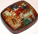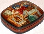 This charming small box is a creation of Novoseltseva from the village of Fedoskino. It depicts the boy lying on the stove, and playing with the kitten. The interior of the peasant's house is skillfully drawn with a lot of details. It gives a possibility to acquaint oneself with a family life of Russian village. The stove is paved with tiles; each tile features a definite geometrical image. Inside the stove there is a cooking pot; peasant food cooked inside the stove is very delicious and good for health. A stove in a Russian village is the center of the house; it is used for generating warmth, for cooking, and also, as it is shown here, Russian peasants like to lie on the stove. From the right of the stove there are two barrels filled with water, and the kettle hung on the wall; they are used as simple appliances for washing. The blanket the boy lies on is made out of multicolored rags. Onions and healing herbs are hung on the walls.