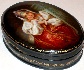 Description: Alexander Zayakin from the village of Fedoskino painted this splendid reproduction of the famous oil-on-canvas painting "By the Stove" painted by the Russian artist Konstantin Makovskiy (1839-1915). This scene is very popular among Fedoskino artists, but the first version of this painting was created by Nikolay Soloninkin.