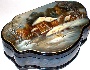 The scene is framed with a gold line. Two parallel gold lines can be also found wrapping around the box's sides; the area between these parallel gold lines is covered with blue paint of various tones and golden dust to imitate coloring of a stone.