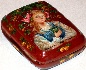 Description: This charming small box is a creation of Pichugina from the village of Fedoskino. It features a little girl standing under the apple tree and eating an apple.