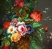 The bouquet is painted in bright oils against the dark green background that strengthens the colors. Gold paint shines almost invisibly through some of the flowers and fruits.
