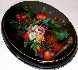 This beautiful oval box is a creation of I. Morozova from the village of Fedoskino. It depicts the still life with flowers, fruits and a nest. The bouquet composed of garden and wild flowers is bright and fresh. Pink roses, white daisies, crimson tulips and tender, blue forget-me-nots surrounded with green leaves covered with morning dew look so impressive! Each flower, bud, tendril, and leave is painstakingly painted to achieve a realistic representation.